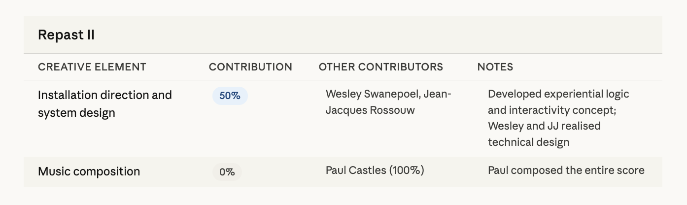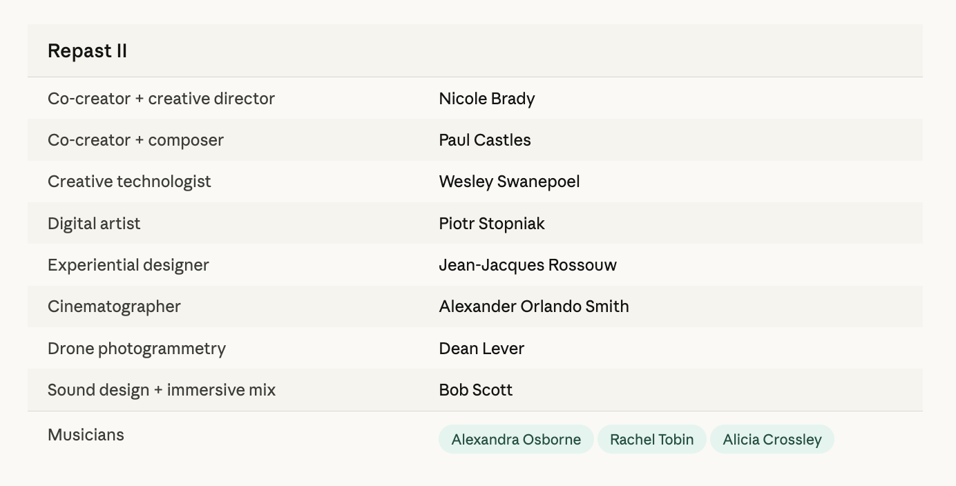 Repast II is an adaptation of its predecessor, using the same digital art assets, digital film, and sound. The aim is to catalyse immersion through cross-modal social interaction (unbounded space). Redesigned as an open-air installation, centring on the eucalyptus tree, an invasive species present both in Australia, where the work was created and filmed, and in South Africa, where it was exhibited. Repast II is an exploration of ecological entanglement, memory and place.