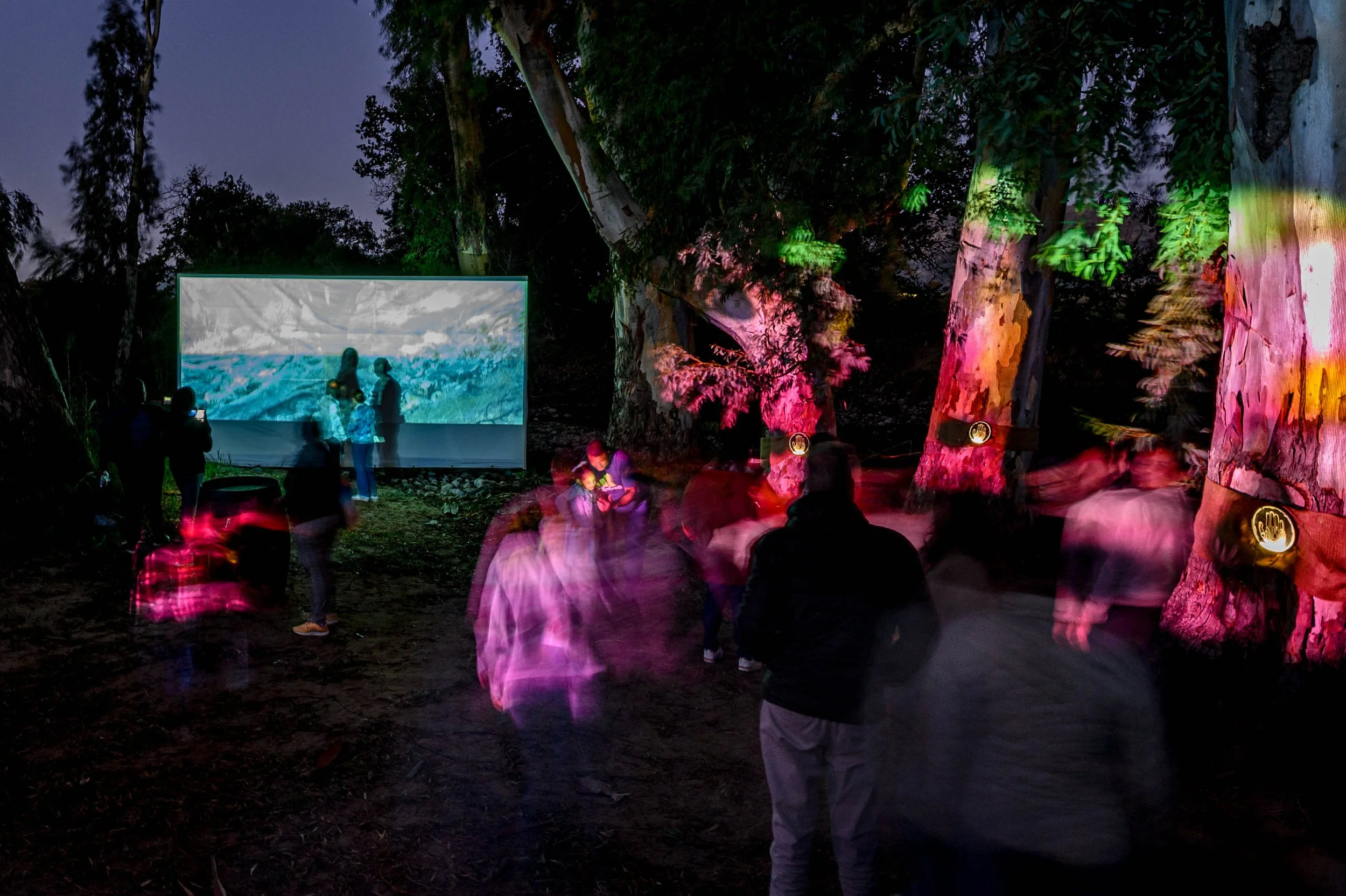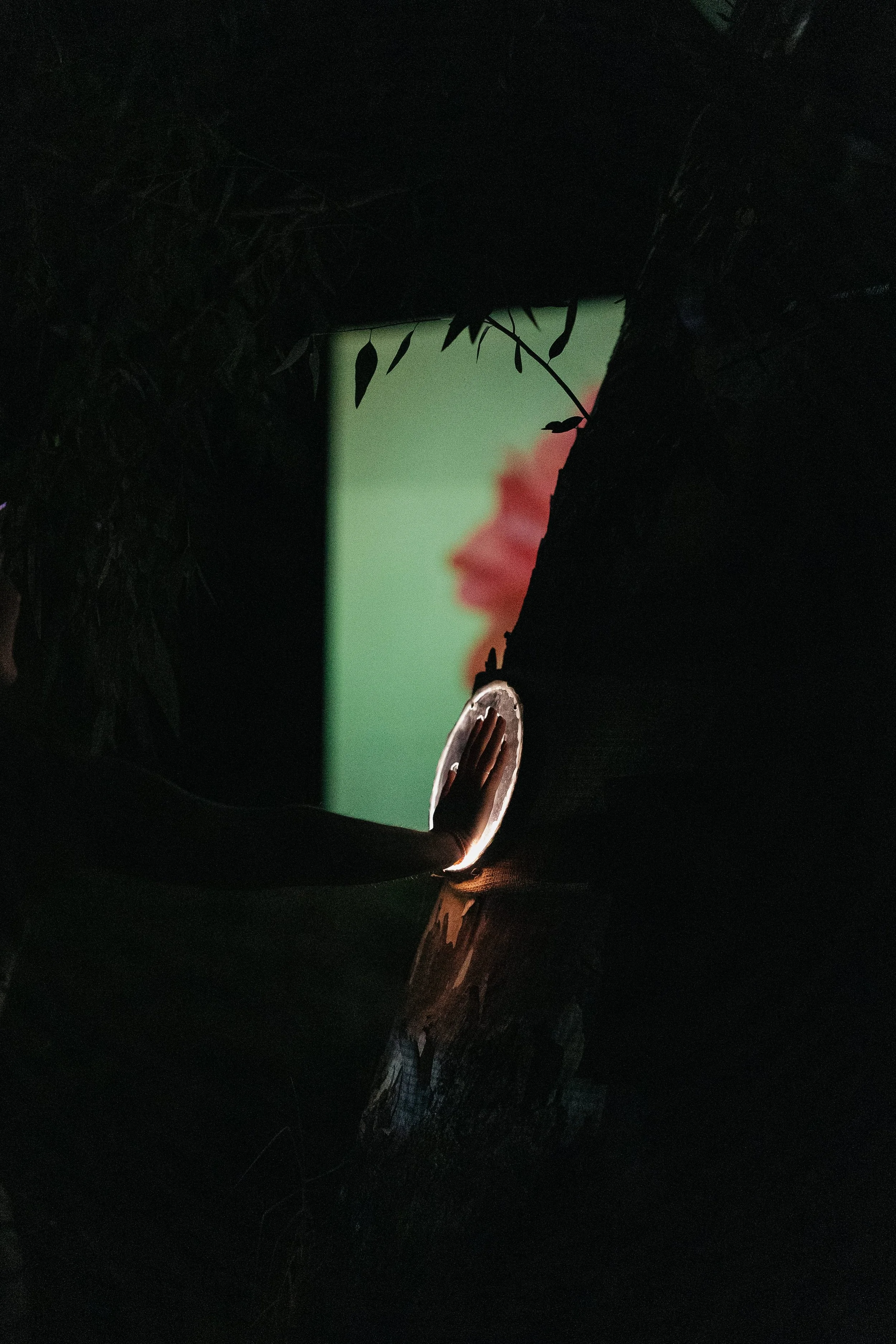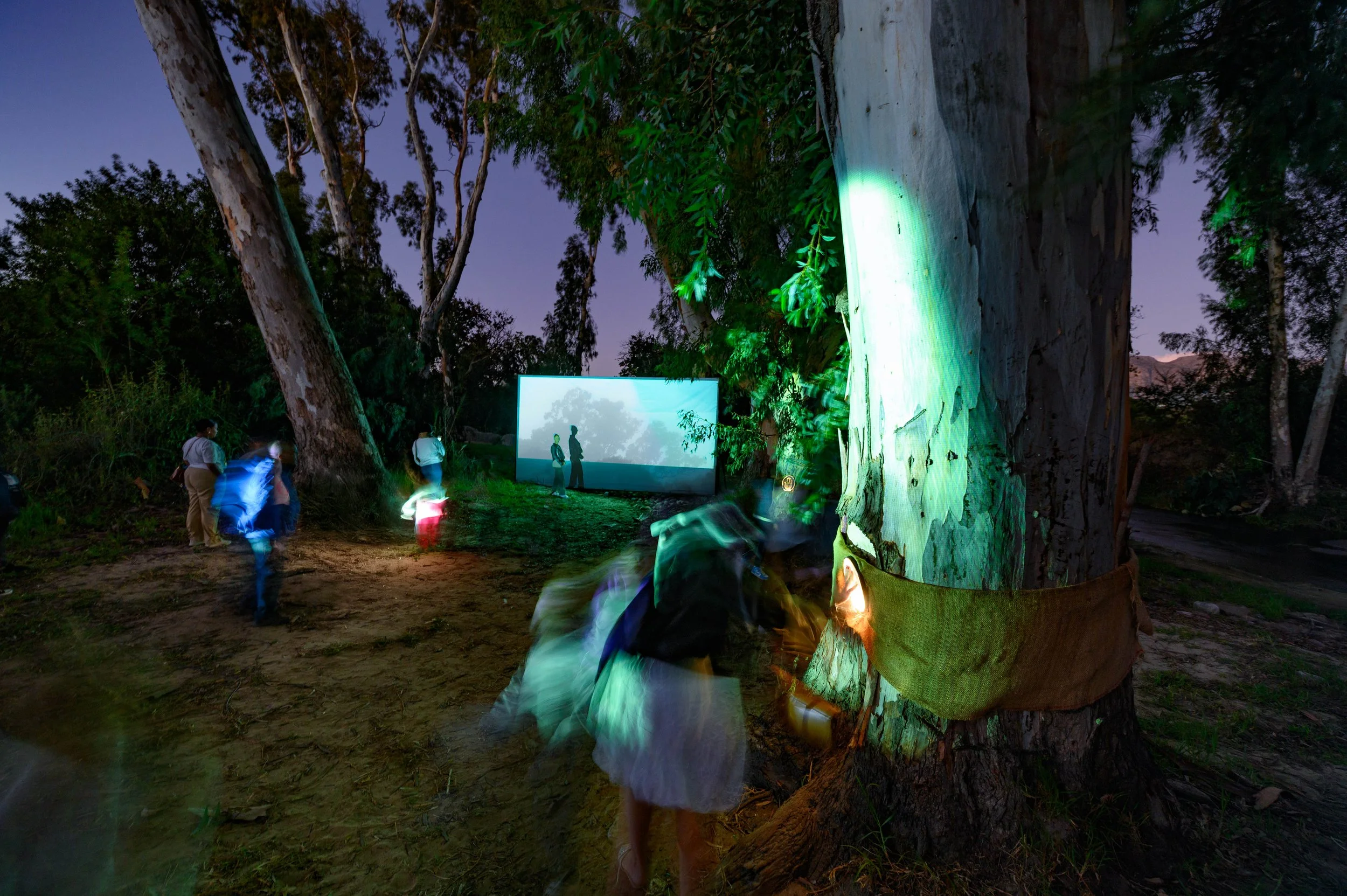 A custom hand-shaped touch capacitor, inspired by the inner workings of a tree, allows participants to trigger cinematic sequences from a moody Australian landscape filmed on location in South Australia onto a screen and a linen sheet, while digital art overlays are projected via projection mapping onto the surrounding eucalyptus trees to extend the boundaries between physical and virtual space.